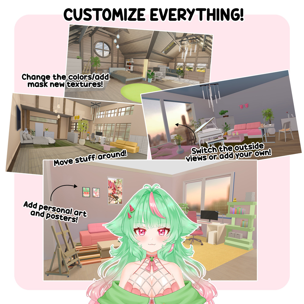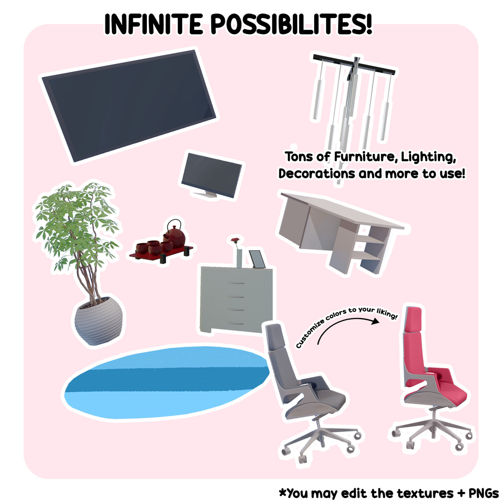 A collection of customizable assets & interiors created and put together to allow for maximum creative control, with the least amount of work and hassle. These backgrounds can be used as interchangeable backdrops for Streamers & VTubers, Indie Games & Visual Novels, Interior design inspiration, a template for artists studying perspective & asset/furniture/texture design and implementation, and much more. All objects, textures, and even backgrounds are separated to allow for extensive creative control, allowing the user to match the backgrounds & interiors to their personalities and ideas.